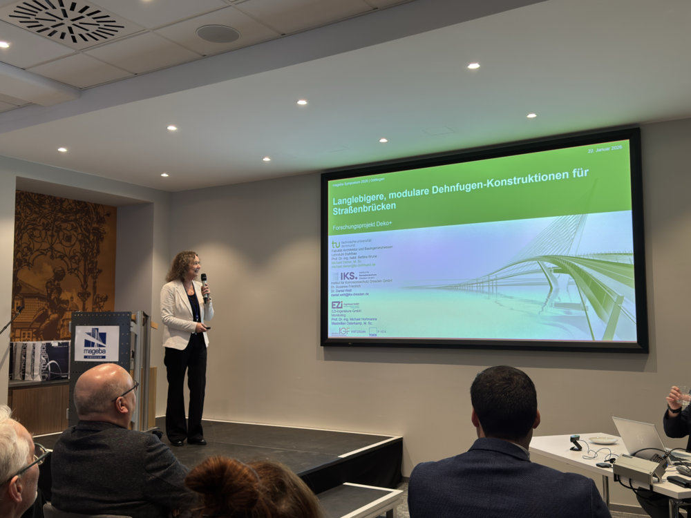 Am 22. Januar 2026 fand in Göttingen das 3. mageba Symposium statt, bei dem sich Fachleute aus Forschung und Praxis aus dem Bereich der Brückenlager und Fahrbahnübergänge zu aktuellen Entwicklungen, nachhaltigen Lösungen und innovativen Ansätzen austauschten. Im Rahmen der Vortragsreihe zum Symposium präsentierte Prof. Brune die aktuellsten Forschungsergebnisse des Projektes Deko+. Dabei ging es neben der Ermittlung der Korrosionsbelastung von Fahrbahnübergängen um eine mögliche Erhöhung der Lebensdauer durch die Verwendung der Feuerverzinkung als Korrosionsschutzsystem und die damit einhergehenden Untersuchungen zur Ermüdungsfestigkeit einer solchen Ausführung.